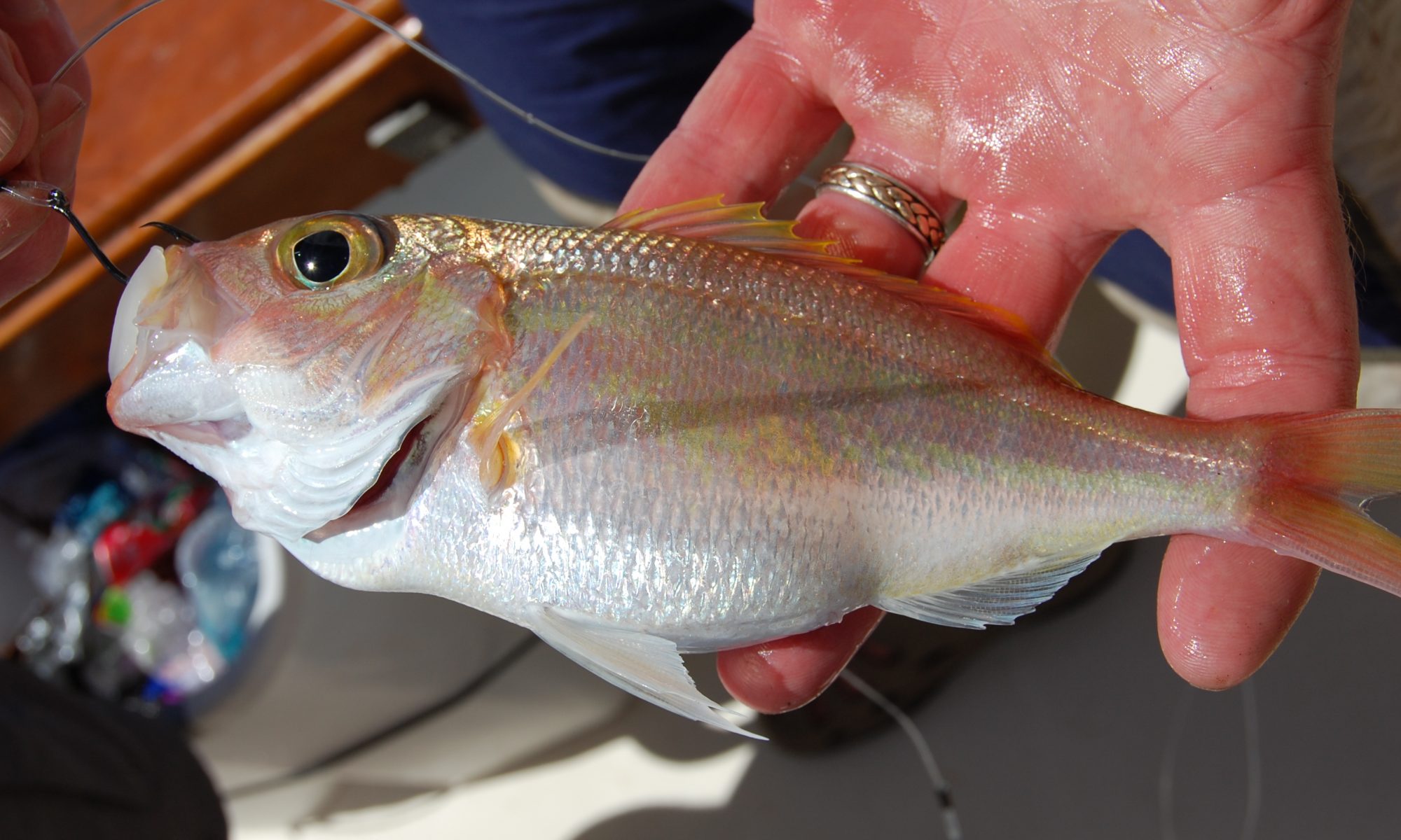 While most anglers prefer to target larger species, one of my crew, Rick Gaido, is actually a child fish predator. While we were deep dropping the same humps where Darrell Bezecny landed his state record Barrelfish, Rick decided to make a drop using sabiki size hooks and tiny pieces of bait. Using rod and reel, and not even realizing he had a bite, Rick brought up this 5 3/4″ specimen, known as a Wenchman Snapper. I doubt that Rick has to worry about a rush of other anglers targeting this species. Rick’s first state record… a snowy grouper, would probably have enjoyed eating his second state record.
